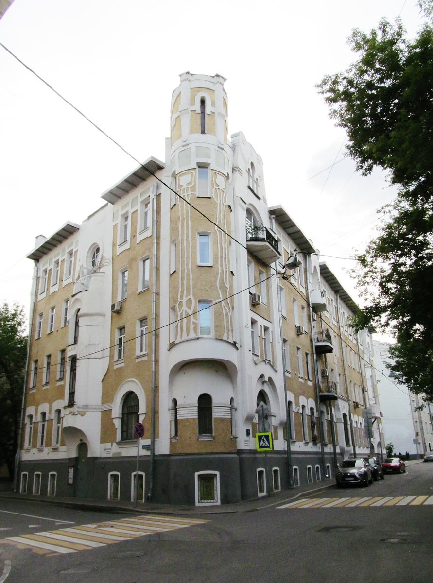 Если вам интересно, какие дома строили для себя архитекторы начала 20 века, то вам надо посмотреть на дом в Казарменном переулке, 5/18. Уникальный образец московского модерна. Это бывший доходный дом Тарховой. Но изначально его построил для себя архитектор Георгий Иванович Макаев. Просто на участке, принадлежавшем с девятнадцатого века жене губернского секретаря Н.Г.Тарховой. Но сам архитектор жил в этом доме до самой своей смерти, хоть и продал свой дом в 1905 году владелице участка. А в 1910 году та продала этот дом дворянке Белоголововой. Ну, а после революции дом национализировали и сделали коммунальным жильем. У этого дома есть разные народные названия. Например, "дом с маками". На эркере (угловом полукруглом выступе фасада) действительно можно видеть маки на длинных стеблях. В модерне тема маков была достаточно популярной и эти цветы можно встретить на многих предметах начала 20 века. Еще некоторые называют этот дом "домом с кошками". Головки маков вверху углового эркера издалек