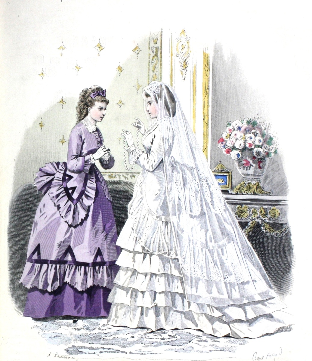 И вновь мы путешествуем во времени по страницам дореволюционных, модных, отечественных журналов. В этот раз мы рассматриваем наряды для свадебных торжеств. Венчальные наряды невест по традиции белого цвета, с красивым цветочным головным убором и легкой прозрачной вуалью. У аристократичных невест 1860-ых годов, по парижской моде, высокая прическа. Волосы слегка завиты спереди и приподняты с боков. Романтичные завитки украшены белыми померанцевыми цветами. Длинная прозрачная вуаль, из газа или тюля «иллюзион» спадает до самого пола, прикрывая цветущую девичью красу.