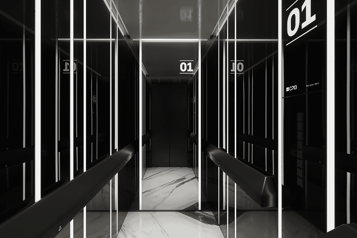 Дизайн пассажирских и грузовых лифтов выполнили в едином стиле. Стены и панели — из полированной зеркальной нержавеющей стали чёрного цвета, пол — керамогранитный с тёмными разводами. «Умный» лифт не только доставляет пассажиров на нужный этаж, но и делает им комплименты, а ещё делится полезной информацией о пого