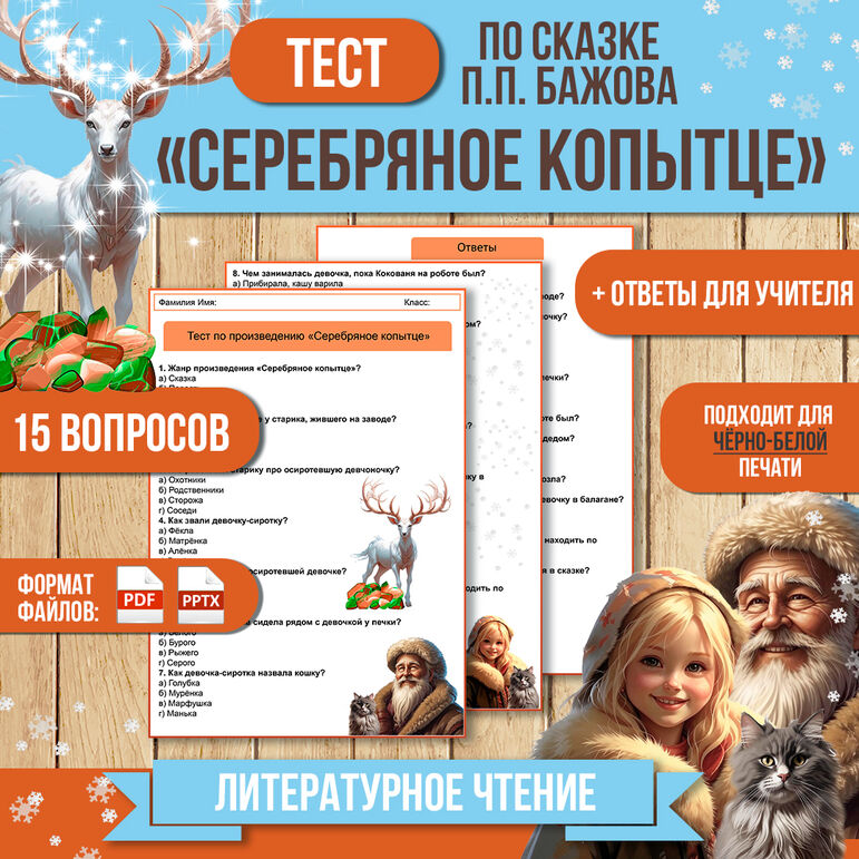 Тест создан по сказке «Серебряное копытце» П.П. Бажова. Материал состоит из двух страниц с 15 вопросами (4 варианта ответа к каждому вопросу). На отдельной странице расположены ответы для учителя. Тест разработан специально к уроку литературного чтения в 4 классе. Материал представлен в двух форматах: PDF и PPTX (редактируемый). Можно распечатать на цветом или черно-белом принтере. Тест «Серебряное копытце» предназначен для проверки знаний и закрепления пройденного материала. Вопросы охватывают основных персонажей, второстепенных персонажей, а также события и детали, фигурирующие в произведении. Данный тест можно скачать здесь. Вам может быть интересно: #литературноечтение #4класс #литературноечтение4класс #тест #начальнаяшкола #школароссии #образование
