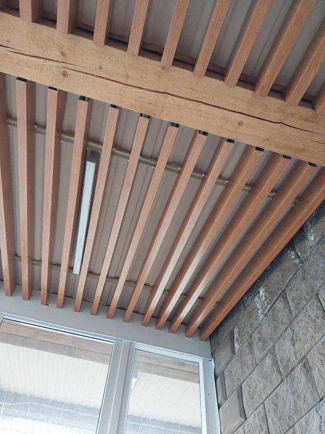 У меня давно родилась идея её оформления нашими металлическими реечными потолками в текстуре дерева, но всё никак не находилось время. И вот, в начале лета я завёз все необходимые материалы на участок и неспешно приступил к самостоятельному монтажу. Дело двигалось небыстро: сказывалась усталость после активных будней и желание провести выходные с семьей. К тому же, несмотря на многолетний опыт работы с потолками, непосредственно монтировать продукцию в таком объеме мне не приходилось.
