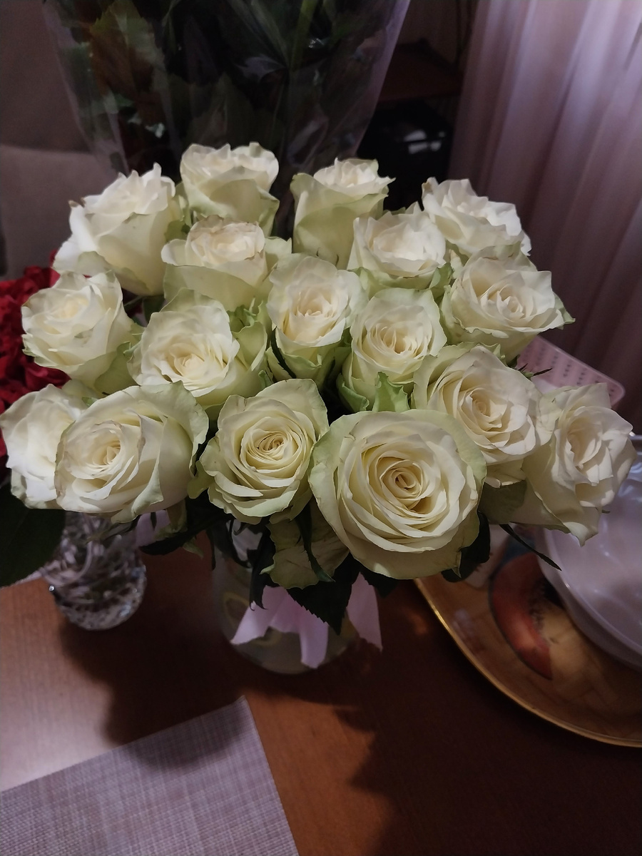 Чистый белый цвет у роз встречается гораздо реже, чем любые его оттенки: немного зелени, мягкий крем, дорогой розовый жемчуг или нежная ваниль. Все эти цвета мы сегодня показываем в нашей статье. На полотне «Рождение Венеры» итальянского художника Сандро Боттичелли появившуюся на свет богиню осыпают белыми розами. Этот цветок стал её символом. В дальнейшем за ним закрепилось значение непорочности, божественности и чистоты. Отсутствие злых помыслов, искренность, доверие, милосердие — всё это символизируют белые розы. С этим букетом связана небольшая история. Год назад, у меня был самый грустный день рождения в моей жизни. Муж уже почти 2 месяца находился в длительной командировке. Для меня это был огромный стресс, к тому же пришлось решать много неожиданных проблем. Я продолжала вести канал и делать вид, что всё по-прежнему, ничего нового в жизни не произошло, всё идёт своим чередом. Проснувшись в день рождения, я почувствовала себя такой несчастной и одинокой, уставшей морально и физи
