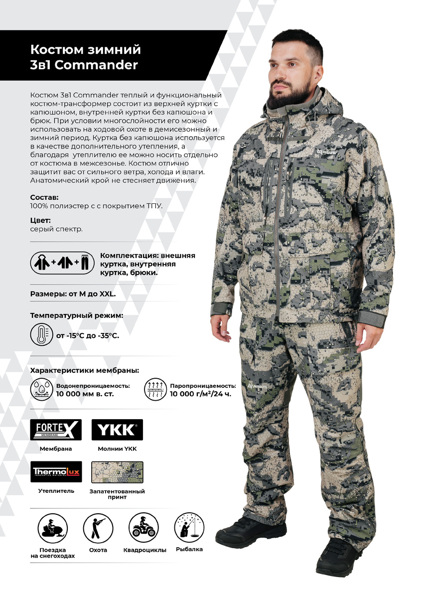 Зимний костюм 3в1 Commander – новинка бренда NISUS, ориентированная на любителей охоты. Костюм 3в1 Commander теплый и функциональный костюм-трансформер состоит из верхней куртки с капюшоном, внутренней куртки без капюшона и брюк. При условии многослойности его можно использовать на ходовой охоте в демисезонный и зимний период. Куртка без капюшона используется в качестве дополнительного утепления, а благодаря утеплителю ее можно носить отдельно от костюма в межсезонье. Костюм отлично защитит вас от сильного ветра, холода и влаги. Анатомический крой не стесняет движения. Штормовая мембрана Fortex с показателями 10 000/10 000 и с покрытием ТПУ обеспечивает хорошую паропроницаемость, что помогает избежать перегрева, а также оставаться сухим при активных физических нагрузках. Уникальный утеплитель Thermolux по теплоизолирующим характеристикам идентичен натуральному пуху, но при этом имеет ряд преимуществ: эластичность, гипоаллергенность, простота в уходе, не скатывается и не деформируется.