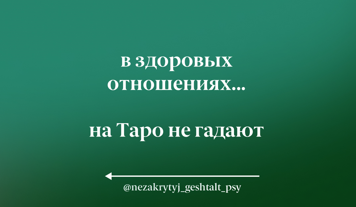 Один из хороших таких, фундаментальных, классных признаков здоровых отношений... знаете... это когда вам не надо смотреть вашу ситуацию на Таро. Онлайн или очно в кабинете гадалок. Когда у вас нет в голове фонового процесса анализа чужих чувств, действий, мотивов. Когда этот анализ стал уже навязчивым автоматизмом. Когда у вас нет нужды "просчитывать" как шахматную партию варианты развитий отношений, вам как-то спокойно и вы в целом понимаете крупными мазками что у вас происходит в отношениях и какой у них вектор. Когда вопрос "Что он думает, что он чувствует, что он сделает" задается не картам с картинками, не рандомным незнакомцам, не автоматизированной системе (привет, онлайн гадание, да, существуют даже такие онлайн сервисы).... а человеку адресно в лицо. И есть уверенность, что он с достаточной откровенностью скажет что он думает, что он чувствует и что он собирается делать. И это не будет вызывать лютейшего диссонанса. (Это когда вас очень любят, но от жены к вам не уходят). Ещ