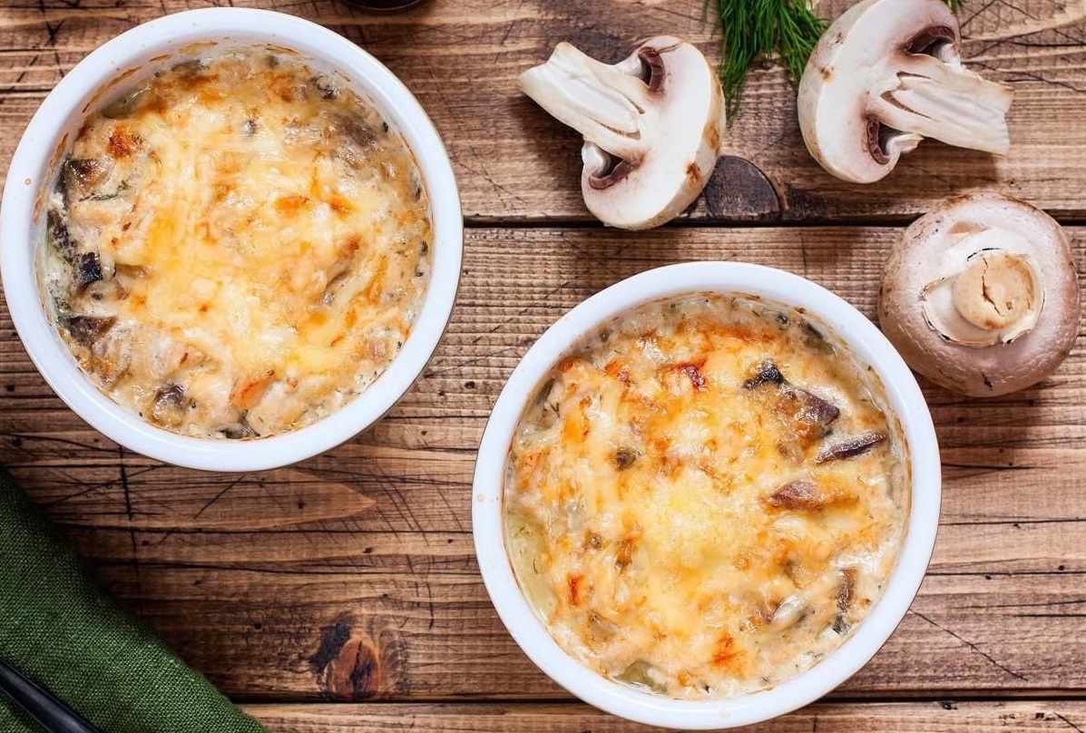За 10 минут до готовности снимите с террина фольгу, включите функцию гриль и увеличьте температуру духовки до 190 градусов. Выньте форму с террином из духовки. Слейте всю выделившуюся жидкость. Покройте верх террина бумагой для выпечки и поставьте сверху что-то тяжёлое, чтобы создать пресс. Это нужно для того, чтобы террин с грибами получился плотным и хорошо резался. Дайте террину полностью остыть при комнатной температуре, а затем так же, в форме и с грузом, отправьте на ночь в холодильник. Готовый террин подавайте холодным с горчицей, хреном или любимым соусом, в качестве холодной мясной закуски.