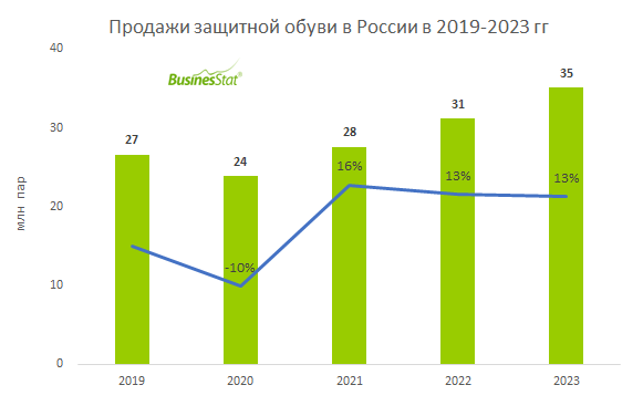 По данным «Анализа рынка защитной обуви в России», подготовленного BusinesStat в 2024 г, за 2021-2023 гг ее продажи в стране выросли на 27% и достигли 35 млн пар.