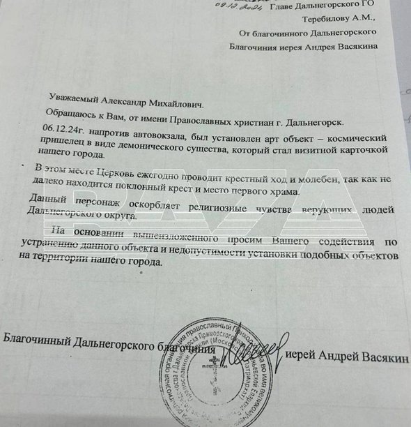 В Приморском крае иерей Андрей Васякин добивается демонтажа скульптурной композиции с инопланетянином Ушаном и летающей тарелкой из мультфильма «Тайна третьей планеты». По мнению священника, памятник «оскорбляет чувства верующих», так как расположен на месте, где проводятся молебны и крестный ход. Об этом сообщает «Подъем». Иерей уже написал письмо мэру Дальнегорска Александру Теребилову от имени православных христиан, в котором указал, что на месте, где стоит скульптура с инопланетянином ежегодно проводятся крестные ходы и молебны, так как рядом располагается поклонный крест и место, где находился первый храм. Арт-объект, по словам инициатора жалобы, представляет собой «космического пришельца в виде демонического существа» и оскорбляет религиозные чувства. По информации издания, бронзовые скульптурные композиции, среди которых оказался и инопланетянин, установила администрация города в рамках нацпроекта «Туризм и индустрия гостеприимства». «Каждый житель Дальнегорска слышал легенду Вы