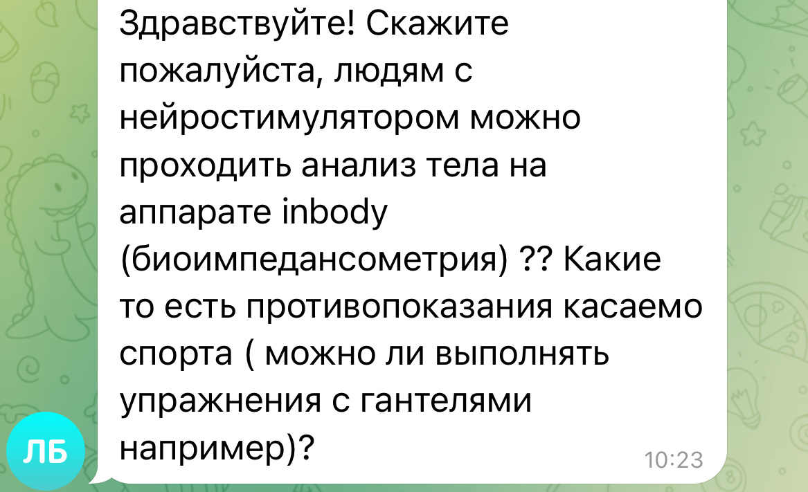 Что касается спорта, то здесь важно различать профессиональный спорт и обычную физическую активность: • Профессиональный спорт нежелателен, так как интенсивные или резкие движения могут повредить систему. Например, электрод может сместиться, оборваться или повредиться. Поэтому участие в видах спорта, требующих резких или взрывных движений, исключается. • Обычная физическая активность (упражнения с гантелями, плавание, бег, танцы) допустима спустя три месяца после установки нейростимулятора. Этот срок необходим для полного заживления тканей и формирования соединительнотканной капсулы вокруг устройства, которая фиксирует его в организме. После трёх месяцев вы можете постепенно возвращаться к умеренной физической активности. Однако любые интенсивные нагрузки стоит обсуждать с врачом. Вывод: • Обычная физическая активность возможна через три месяца после операции, но профессиональный спорт лучше исключить.