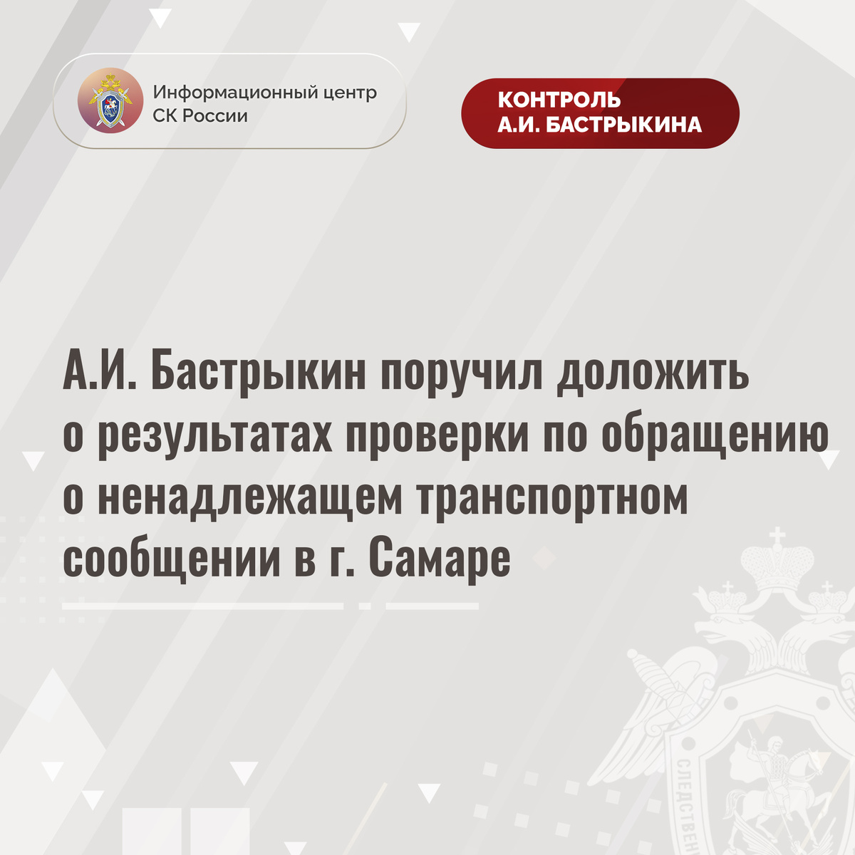 А.И. Бастрыкин поручил доложить о результатах проверки по обращению о ненадлежащем транспортном сообщении в г. Самаре К Председателю СК России А.И. Бастрыкину в комментариях в социальной сети обратилась многодетная мать из города Самары по вопросу нарушения прав жителей Октябрьского района. В связи с тем, что единственный муниципальный автобус курсирует только один раз в час, школьники вынуждены пешком добираться до образовательных учреждений, в том числе в темное время суток, что создает угрозу их жизни и здоровью. При этом в коммерческом общественном транспорте оплата проезда на льготной основе не осуществляется, в связи с чем инвалиды и пенсионеры также с трудом могут добраться до социальных и медицинских учреждений. В СУ СК России по Самарской области по поступившему обращению организована процессуальная проверка. Председатель Следственного комитета Российской Федерации Александр Иванович Бастрыкин поручил и.о. руководителя СУ СК России по Самарской области Александру Владимировичу