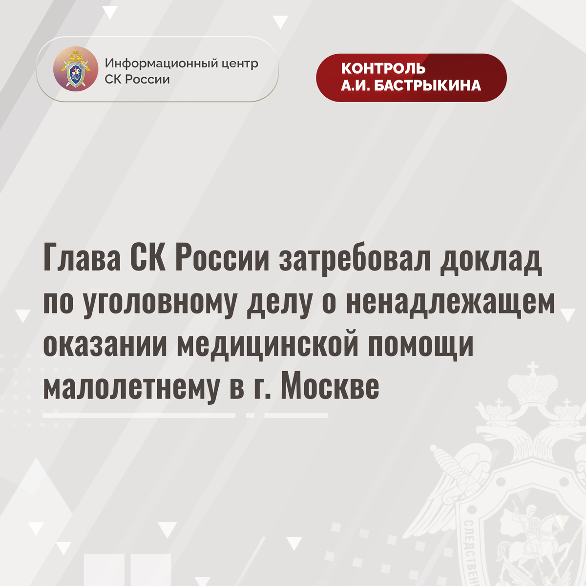 Глава СК России затребовал доклад по уголовному делу о ненадлежащем оказании медицинской помощи малолетнему в г. Москве В комментариях в аккаунте приёмной Председателя СК России А.И. Бастрыкина «ВКонтакте» размещено обращение жительницы города Москвы. Она выражает несогласие с ходом установления обстоятельств смерти ее годовалого сына. В феврале прошлого года ребенок, страдавший врожденным пороком сердца, госпитализирован в больницу для проведения плановой операции. После хирургического вмешательства состояние мальчика ухудшилось, что привело к летальному исходу. Отмечается, что расследование приняло затяжной характер. В ГСУ СК России по городу Москве по данному факту расследуется уголовное дело. Председатель Следственного комитета Российской Федерации Александр Иванович Бастрыкин затребовал у руководителя ГСУ СК России по городу Москве Андрея Александровича Стрижова доклад о ходе и результатах расследования уголовного дела. Исполнение поручения поставлено на контроль в центральном апп