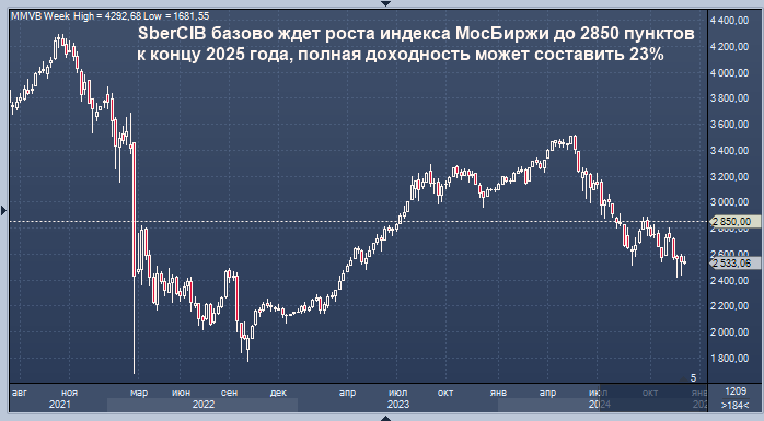 SberCIB базово ждет роста индекса МосБиржи до 2850 пунктов к концу 2025 года, полная доходность может составить 23% График индекса Мосбиржи интервалами в 12 неделю Аналитики инвестиционного банка SberCIB прогнозируют рост индекса МосБиржи к концу 2025 года до 2850 пунктов в рамках базового сценария. Такой прогноз был озвучен в ходе вебинара, посвящённого перспективам будущего года. «Вкупе с дивидендной доходностью в 11% наша оценка подразумевает полную доходность индекса на уровне 23%», — отметили они. Оценка индекса по мультипликатору P/E на следующие 12 месяцев составляет 3,3, что находится вблизи минимальных значений 2022–2023 годов. По мнению аналитиков, давление на рынок продолжит оказывать жёсткая денежно-кредитная политика Банка России. В следующем году эксперты отдают предпочтение экспортёрам, особенно компаниям, занимающимся добычей нефти и золота. Среди них — «ЛУКОЙЛ» и «Татнефть» в нефтегазовом секторе, а также «Полюс» в золотодобыче. Также аналитики выделяют компании с высо