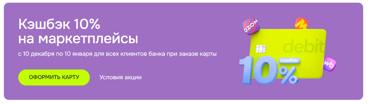 ОТП решил не отставать от других банков, которые предлагают кэшбэк за покупки на маркетплейсах (например, такая акция сейчас у Газпромбанка). Что предлагает банк при оформлении карты? Дополнительно открывается накопительный счет. Базовая процентная ставка по нему 6% годовых, при тратах по карте от 40 тыс рублей в месяц - 20% годовых. Условие - траты от 7000 рублей. Деньги можно вывести, если у вас накопилось больше 500 рублей кэшбэком. Ссылка на правила акции "Новогодние 10% в маркетплейсах" Максимальная сумма бонусов по этой акции - 1000 рублей. Если хотите, можете оформить карту по моей реферальной ссылке, тогда вы получите дополнительно 500 рублей за оформление, при условии, что вы потратите 3000 рублей в течение 30 дней с момента активации карты.