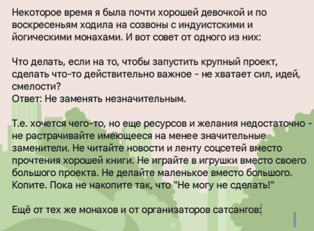 Некоторое время я была почти хорошей девочкой и по воскресеньям ходила на созвоны с индуистскими и йогическими монахами. И вот совет от одного из них: Что делать, если на то, чтобы запустить крупный проект, сделать что-то действительно важное - не хватает сил, идей, смелости? Ответ: Не заменять незначительным. Т.е. хочется чего-то, но еще ресурсов и желания недостаточно - не растрачивайте имеющееся на менее значительные заменители. Не читайте новости и ленту соцсетей вместо прочтения хорошей книги. Не играйте в игрушки вместо своего большого проекта. Не делайте маленькое вместо большого. Копите. Пока не накопите так, что "Не могу не сделать!" Ещё от тех же монахов и от организаторов сатсангов: После сатсанги - не расплескивайте. То есть вы получили на сатсанге что-то важное - энергию благостную, ясность, понимание, широту мысли - а потом пошли вести суетные разговоры с людьми. Всё расплескали. Речь - самый большой отток энергии, ясности мысли, уравновешенности. И еще на себя от л