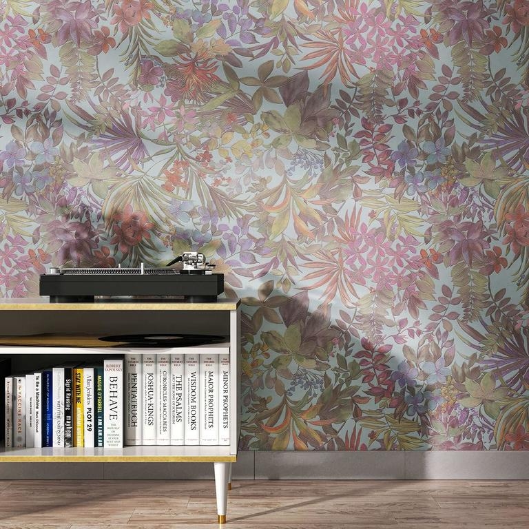 В просторной спальне разместите панно с крупными цветами за изголовьем кровати. Остальные стены оформите в спокойный оттенок, перекликающийся с цветочным принтом.