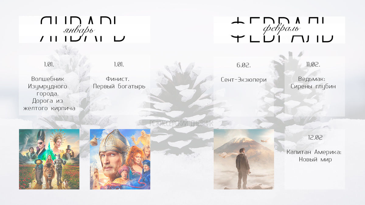 На носу 25-й год — и я представляю вам 20 проектов, у которых уже точно известны даты проката! Создала для вас календарь кинопремьер на следующий год из самых ожидаемых по рейтингу проектов :3. (Не дизайнер, но надеюсь, что вам понравится, я старалась ❤️ Можно скринить, сохранять, в общем, пользоваться, но для себя ❤️) Сейчас гремит мюзикл «ЗЛАЯ», который рассказывает предысторию двух волшебниц — доброй Глинды и злой Эльфабы (но все не так однозначно, конечно же). В 2025 должна выйти вторая часть, но точной даты еще нет. Зато 1 января выходит отечественная одноименная сказка. Возможно, по переводу-адаптации Волкова. Возможно полностью оригинальное переосмысление. В любом случае, интересно будет посмотреть! Приквел? Вбоквел? Франшизы «ПОСЛЕДНИЙ БОГАТЫРЬ». Первая часть мне понравилась. Сейчас вышел сериал, в новом году ждет расширение франшизы. Да, тот самый, что написал «Маленького Принца». Байопик, очень интересно будет посмотреть! Мультфильм во вселенной Ведьмака. Продолжение франшизы