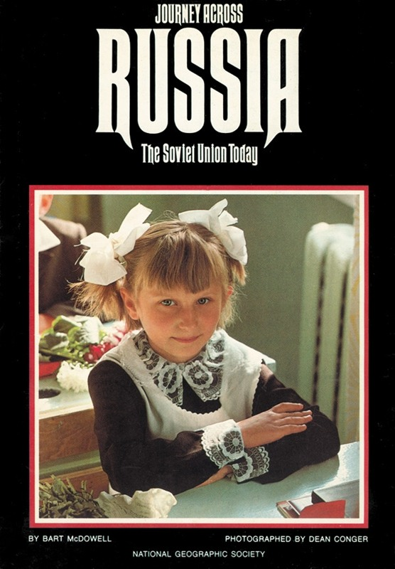 В 1977 году американское Национальное географическое общество выпустило книгу "Путешествие по России: Советский Союз сегодня", рассказывающую про историю, культуру и быт народов СССР. Авторы книги журналист Bart McDowell и фотограф Dean Conger провели в СССР два года и, объехав все пятнадцать республик и десятки городов, представили западному читателю большой труд длиной 370 страниц и сотни фотографий - портрет огромной страны и ее жителей. Первый день занятий — украинская младшеклассница гордо позирует в парадной форме, украшенной кружевным воротничком и манжетами. Многоликий Советский Союз. Мороженщицы на Крещатике, главной улице Киева. Девушки восхищаются «Данаей» Рембрандта из знаменитой коллекции Государственного Эрмитажа. Академгородок близ Новосибирска. Врач обследует девочку, перенесшую открытую операцию на сердце. Жилые здания в кубистском стиле возвышаются над улицами восстановленного Ташкента — крупнейшего советского города к востоку от Урала. Зимой якутские строители не да