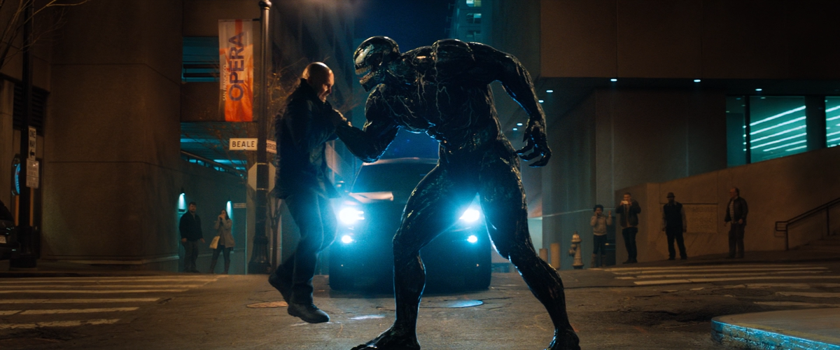 И вот тут начинаются проблемы. Визуальный стиль Венома тёмный, мрачный и... слишком тёмный. Постоянные сцены ночью, отсутствие контрастных цветов и туманная картинка делают происходящее менее понятным. Чёрный Веном сражается с серым Риотом на фоне серой ночной дымки, и зрителю остаётся только гадать, кто кого побеждает.