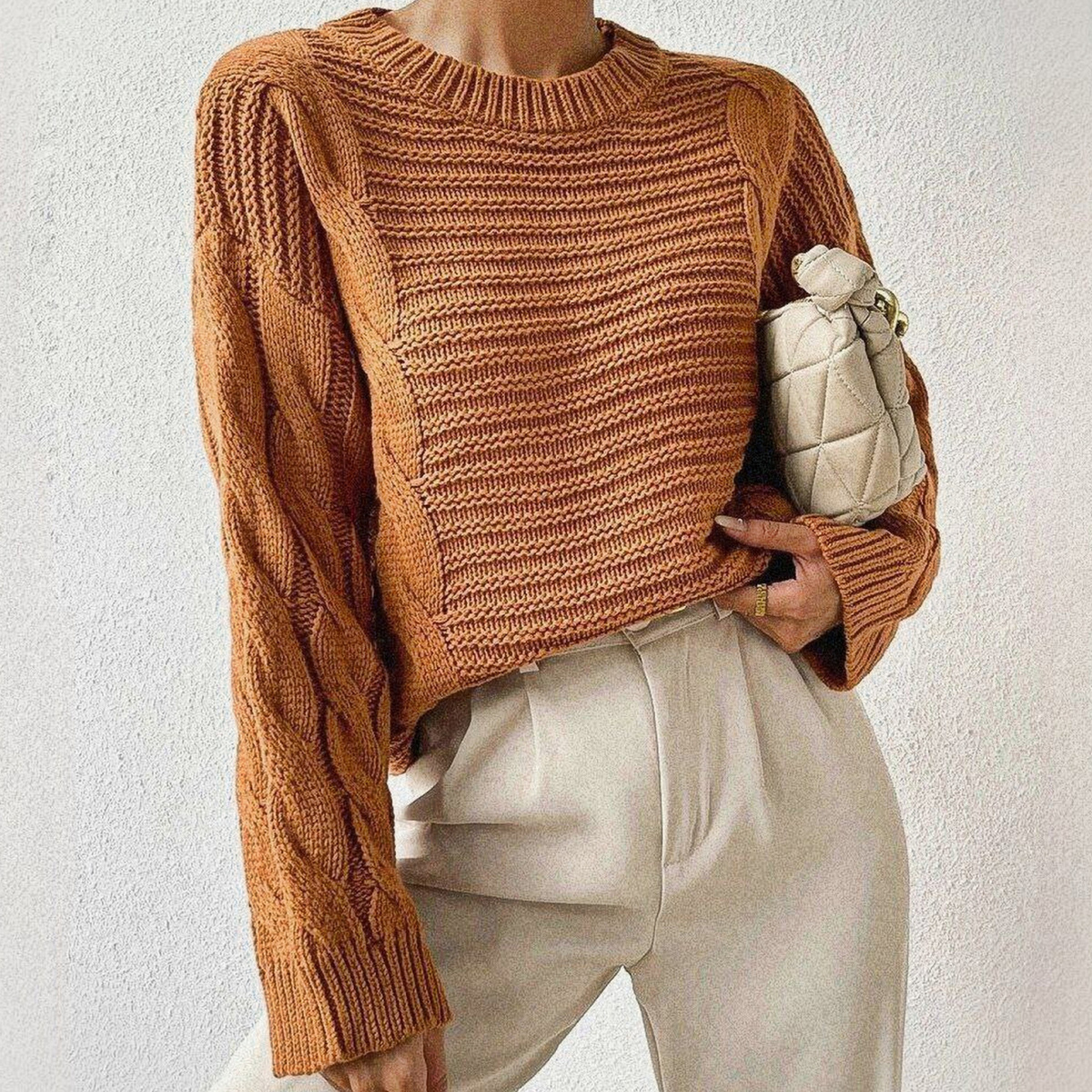 Ещё одна стильная модель в терракотовых тонах. Здесь очень нежный приглушённый оттенок, который отлично сочетается с объёмным узором. Любите английскую резинку, но она вам немножко надоела? Тогда «добавим красок» этому не сложному, но так горячо любимому узору, который особенно актуален в зимнее время!
