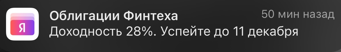 У Яндекс Финтех завтра (11.12.24) будет первичное размещение, минимальный размер участия 10.000₽, а доходность до 27% годовых. Давайте отметим плюсы бумаги: А также встроили платежный функционал в следующие сервисы: Яндекс Еда, Деливери, Яндекс Лавка, Яндекс Такси, Яндекс Маркет и другие партнеры, которые постоянно увеличиваются. Кстати, пользователям Пэй, пришло такое уведомление Что касаемо доходности: Купон — до 25% в месяц Если реинвестировать в облигации, доходность повысится до — 28.6% Безопасность — eAAA Амортизация — 1 год Выплаты по купонам будут приходить каждое 27-е число месяца Размещение запланированно на 12.12.24, а сбор заявок до 15:00 10.12.24 Я буду учавствовать с минимальным размером, на 10.000₽, а также планирую реинвестировать в данную бумагу, так как верю в развитие Яндекса и его платежных систем, которые вытесняю рынок банковских продуктов, за счет своей практичности и взаимной бонусной программе между сервисами. Делитесь в комментариях, кто тоже планирует п