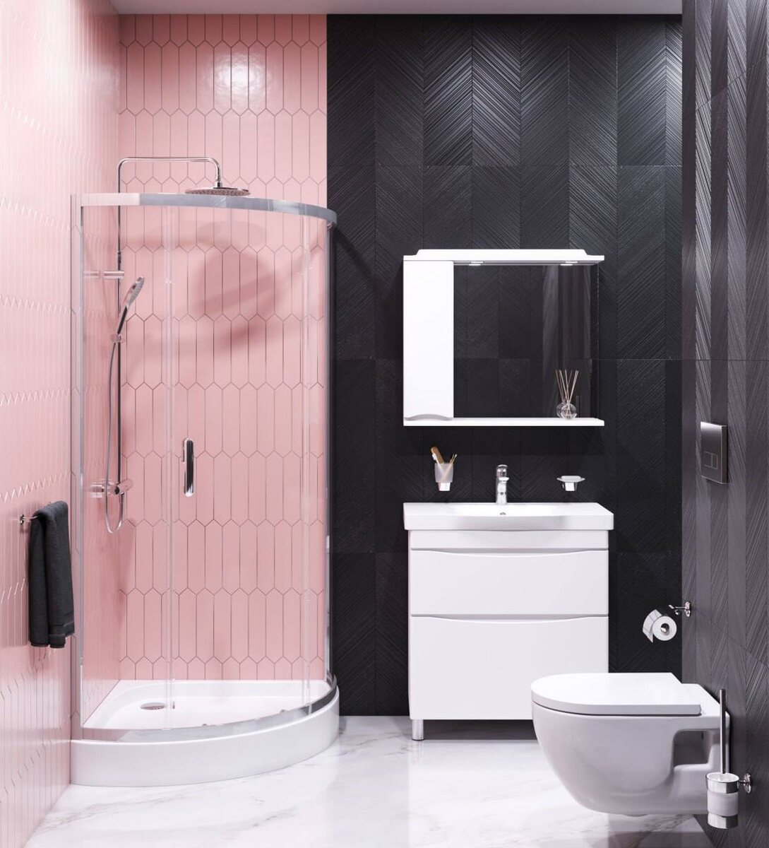 Геометрические узоры также могут визуально расширить стены и приподнять потолок. Для этого используют вертикальные или горизонтальные линии контрастного цвета, форму плитки, диагональную укладку.