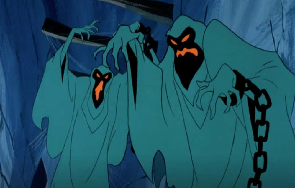 Во время погони Велма поднимает звонящий телефон, а затем вручает его друзьям, отвлекая "призрака". А Шэгги и Скуби пытаются отпугнуть привидение с помощью пробок от бутылок. Сезон 1, эпизод 11