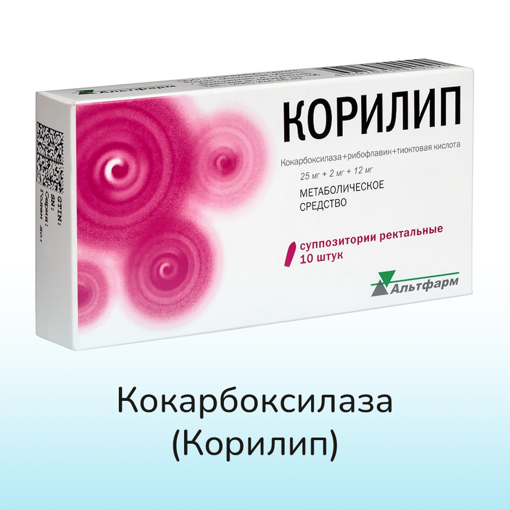 Кокарбоксилаза — это активная, коэнзимная форма витамина B1, она является основным действующим веществом свечей Корилип.