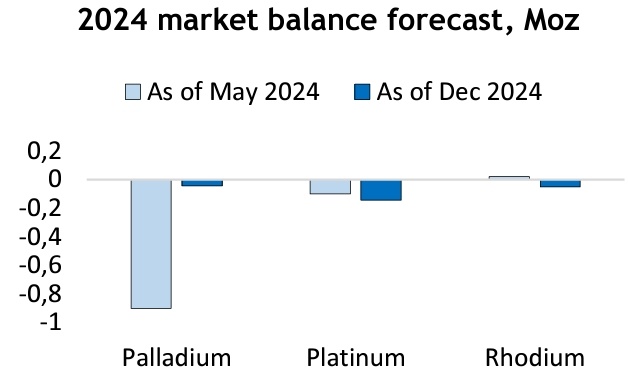 Компания прогнозирует сбалансированный рынок палладия и платины, ожидает профицит в никеле и меди. «Норникель» пересмотрел свою предыдущую оценку рынка палладия на 2024 год с дефицита в 0,9 млн унций до почти сбалансированного состояния, говорится в пресс-релизе российской горнодобывающей компании на ее сайте. Это связано с более высоким объемом производства в России и существенным пересмотром спроса на автомобильную продукцию. «В 2025 г. рынок палладия останется сбалансированным, поскольку снижение добычи в Северной Америке и Южной Африке будет компенсировано восстановлением вторичной переработки автокатализаторов. В то же время общий спрос, как ожидается, будет стагнировать, если не произойдет значительного ускорения в качестве реакции на снижение процентных ставок в западном мире и меры поддержки экономики в Китае». «Норникель» считает рынок платины сбалансированным в этом году и ожидает дефицит в размере 0,2 млн унций в 2025 году. «В 2025 г. рынок платины останется практически сбал