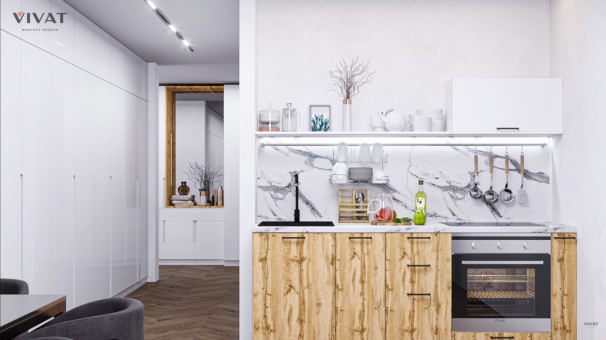 При выборе кухни для квартиры-студии многие задаются вопросом: как сделать ее одновременно компактной и функциональной? Чтобы обеспечить максимальное удобство, комфорт и стиль, необходимо грамотно использовать каждый сантиметр пространства. Делимся дизайн-решениями, которые помогут создать идеальную кухню в небольшой квартире-студии. Если вы не часто готовите и цените простоту, то компактная прямая кухня до двух метров без верхних шкафов — отличный вариант. Вместо традиционных верхних модулей используется полка, которая добавляет пространству открытости и современности, а также визуально увеличивает помещение. Если вы не хотите утяжелять дизайн, а места на кухне требуется больше, то сделайте выбор в пользу угловой кухни со стойкой. Такое решение позволит создать уютную обеденную зону и добавит место для приготовления пищи. Для максимального использования вертикального пространства подойдет кухня с высокими внешними шкафами. Это поможет разместить все необходимое и снизить визуальный ш