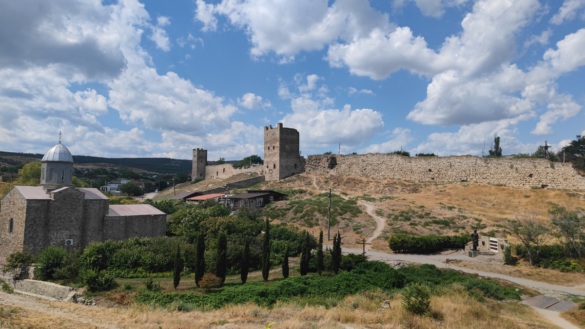 Во время пребывания в Феодосии мы прогулялись по развалинам Генуэзской крепости. Здесь сохранились также три старинные церкви. На протяжении почти восьми веков на территории Апеннинского полуострова существовала Генуэзская республика. В период своего расцвета генуэзцы возвели несколько крепостей, и одна из них — Кафа — находится как раз в Феодосии. Она была построена в первой половине XIV века. Древняя цитадель защищала поселение от набегов врагов и по своим размерам была одной из крупнейших в Европе. Высота стен достигала 11 метров, толщина — 2 метра, а длина — 718 метров, из которых до наших дней сохранились 469 метров. Богатый порт города называли "второй Генуей". Впоследствии город завоевали османские, а затем русские войска. Большую часть укреплений разобрали в XIX веке, когда они утратили своё военное значение. До наших дней дошла лишь часть стен и башен когда-то грандиозной крепости.