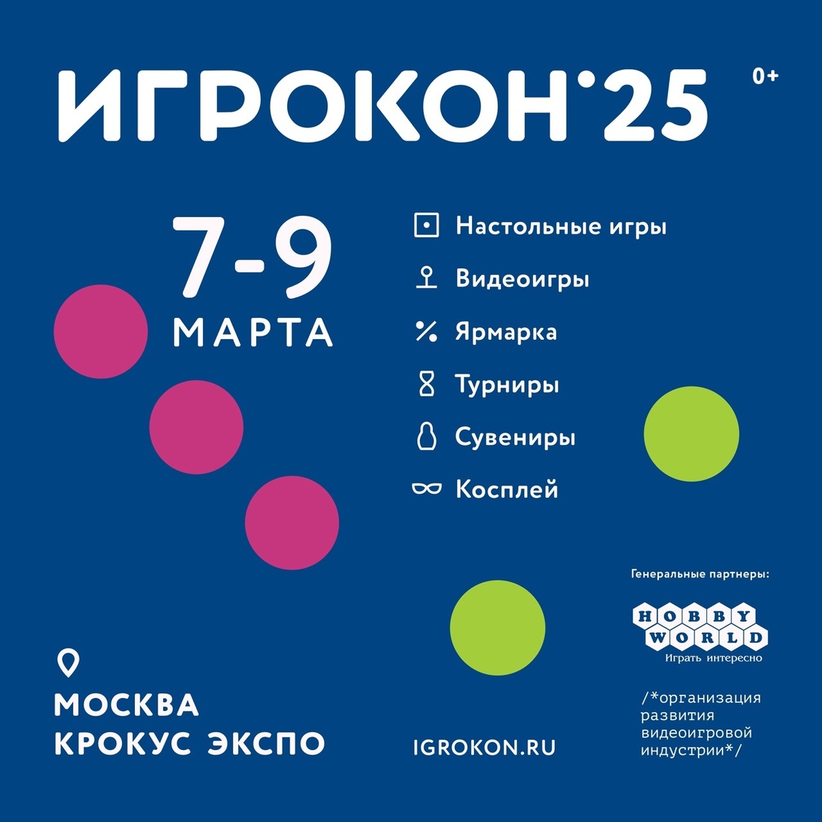 Наше мероприятие прошло очень круто, но вы же еще не разбежались? Нет? Вы с нами? Это хорошо, потому, что совсем скоро будет еще круче и масштабнее🔥 В общем, наверняка вы слышали о том, что в начале следующего года свои двери распахнет возрождаемый и легендарный Игрокон, который пройдет 7, 8 и 9 марта 2025 года в «Крокус Экспо». Билеты уже можно купить, кстати, лучше успеть пока они еще не подорожали. Так вот, мероприятие отныне не только про настольные игры, но и про видеоигры. Генеральными партнерами события стали Hobby World и Организация развития видеоигровой индустрии (РВИ) которым мы признательны за помощь с нашим недавно прошедшим мероприятием ИГРОПРОМ в этом году💥 От организаторов: В новом для фестиваля видеоигровом пространстве мы постараемся объединить всех поклонников этой культуры — от разработчиков, художников и геймдизайнеров до геймеров и фанатов индустрии. Вас будет ждать зона видеоигр, где вы сможете познакомиться с новинками, первыми опробовать грядущие релизы, поу
