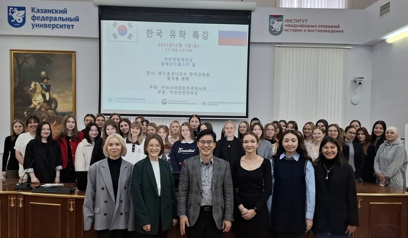7 декабря 2024 года в Институте международных отношений Казанского федерального университета прошла специальная лекция атташе по образованию посольства Республики Корея господина Хам Сок Донга. Лекция была посвящена теме высшего образования в Корее и собрала большое количество студентов, интересующихся корейским языком и культурой. В рамках лекции господин Хам Сок Донг подробно рассказал о системе высшего образования в Корее, ведущих университетах страны, а также о растущем количестве иностранных студентов, обучающихся в корейских вузах. По его словам, в 2023 году в университетах Кореи обучалось около 2,5 тысяч студентов из России, что поставило Россию на 10-е место по числу иностранных студентов среди всех стран. Атташе также отметил высокий уровень владения корейским языком у российских студентов, подчеркнув, что он в среднем выше, чем у студентов из других стран. Это, по его словам, является ярким примером глубокого интереса российских студентов к корейской культуре и образованию. О