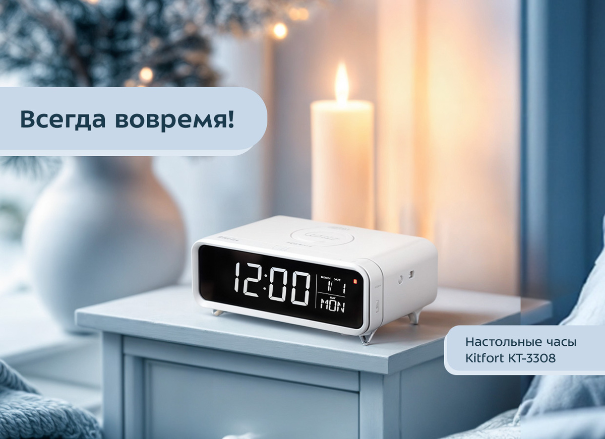 Мечтаете просыпаться каждый день в одно и то же время, никогда не опаздывать и при этом всегда иметь полностью заряженный телефон? С настольными часами Kitfort КТ-3308 эта мечта может стать реальностью. С помощью этих часов вы станете более организованным и пунктуальным, а ваши дела будут всегда выполняться вовремя. А дополнительная функция в виде беспроводной зарядки телефона оценят все, кто любит сразу после пробуждения заглянуть в телефон. Они прекрасно подойдут для школьников и студентов, которым необходимо рано вставать и правильно организовать свой день. Многофункциональность. Настольные часы КТ-3308 выполняют сразу несколько функций: показывают время, служат будильником и светильником. Благодаря беспроводной зарядке, встроенной в верхнюю часть корпуса, вы можете с лёгкостью заряжать телефон, часы или другие устройства. Будильник. На настольных часах вы можете установить будильник. Сигнал будильника можно отложить на 5 минут или отключить. Время отложенного сигнала можно настроит