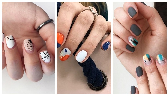 Штрихи, линии, мазки, произвольные геометрические фигуры — объединив каждый из перечисленных пунктов вы получите максимально яркий и трендовый дизайн маникюра, который отличное смотрится на коротких ногтях различной формы.