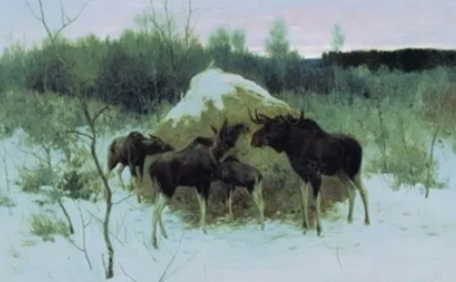 Сегодня мы будем писать сочинение по картине Степанова "Лоси". Эта картина полна жизни и показывает нам, как важна забота о животных в нашем мире. В центре картины Степанова изображено удивительное семейство лосей. Большой лось с ветвистыми рогами величественно охраняет своих близких, внимательно наблюдая за тем, как его семья лакомится сеном. Этот момент спокойствия и заботы сразу же обращает на себя внимание, напоминая нам о том, как важно защищать и заботиться о тех, кто нам дорог. Рядом с ним стоит лосиха, её нежный взгляд полон любви и внимания. Можно почти услышать, как она тихо шепчет что-то лосю, выражая свою поддержку. А двое маленьких лосей с радостью едят сено, которое оставили лесники — это делает картину особенно трогательной. Светлый золотистый стог сеном с белоснежной шапкой снега служит напоминанием о человеческой заботе о животных, показывая, что даже в холодное время года они не остаются без помощи. На заднем плане картины мы видим молодые деревья, которые с каждым ша