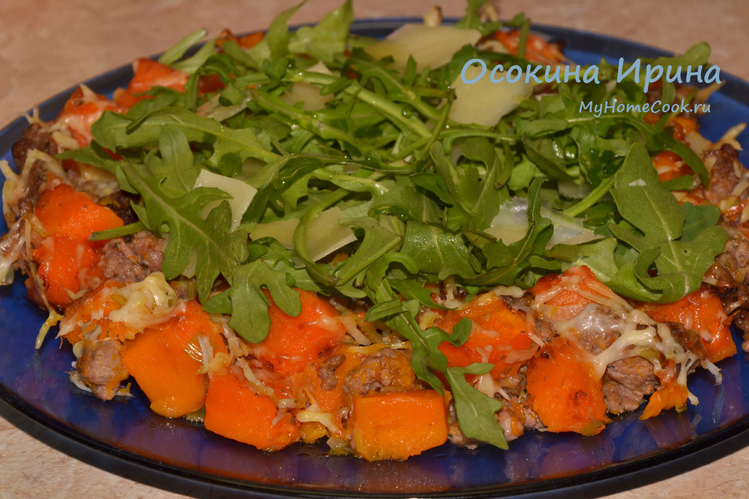 В сотейнике обжарила 0,5 кг фарша из ягнятины с добавлением соли, перца и сушеной петрушки и переложила в миску, на оставшемся жиру обжарила быстро около 0,5 кг тыквы средними кубиками, вернула фарш, добавила 2 рубленных зубчика чеснока, влила немного кипятка, присолила и промешала, посыпала горстью тёртого пармезана и запекла всё в духовке, разогретой до 180 градусов, в течение 15 минут, достала, дала немного "отдохнуть" и разложила по тарелкам, поверх выложила по горсти рукколы, накидала немного стружки пармезана, сбрызнула оливковым маслом и сразу подала. Волшебно! Невообразимая вкуснятина) Приятного аппетита