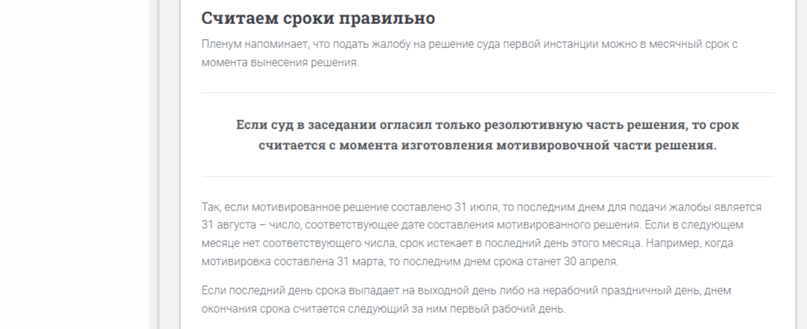 Если суд в заседании огласил только резолютивную часть решения, то срок считается с момента изготовления мотивировочной части решения.Так, если мотивированное решение составлено 31 июля, то последним днем для подачи жалобы является 31 августа – число, соответствующее дате составления мотивированного решения. Если в следующем месяце нет соответствующего числа, срок истекает в последний день этого месяца. Например, когда мотивировка составлена 31 марта, то последним днем срока станет 30 апреля.Если последний день срока выпадает на выходной день либо на нерабочий праздничный день, днем окончания срока считается следующий за ним первый рабочий день.