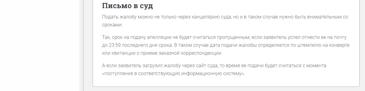 Письмо в суд Подать жалобу можно не только через канцелярию суда, но и в таком случае нужно быть внимательным со сроками.Так, срок на подачу апелляции не будет считаться пропущенным, если заявитель успел отнести ее на почту до 23:59 последнего дня срока. В таком случае дата подачи жалобы определяется по штемпелю на конверте или квитанции о приеме заказной корреспонденции.А если заявитель загрузил жалобу через сайт суда, то время ее подачи будет считаться с момента «поступления в соответствующую информационную систему».