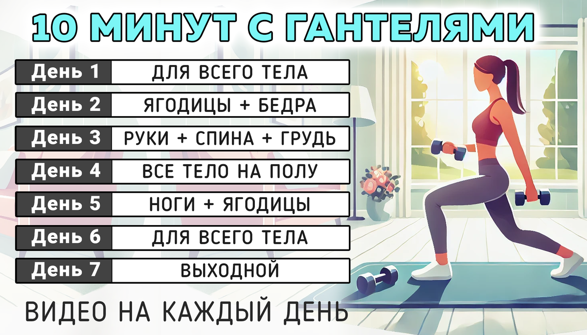 Если у вас нет времени на длительные занятия спортом, короткие тренировки с гантелями – это идеальный способ поддерживать тело в тонусе и укреплять мышцы, не выходя из дома. Всего 10 минут в день, и вы сможете задействовать все основные группы мышц, ускорить метаболизм и улучшить общее самочувствие. Такие тренировки подходят для любого уровня подготовки, так как их можно легко адаптировать под свои возможности, выбирая вес гантелей и темп выполнения. А разнообразие упражнений поможет проработать проблемные зоны, укрепить тело и добиться стройной, подтянутой фигуры. Для достижения максимального эффекта мы предлагаем план из 6 коротких видео, которые можно выполнять в течение недели. Каждое видео состоит из 15 упражнений по схеме: 30 секунд работы и 10 секунд отдыха. Такая структура обеспечивает равномерную нагрузку и помогает добиться заметных результатов. Рекомендации по весу гантелей: Для упражнений с одной гантелью вес можно увеличить. Эта тренировка прорабатывает все основные групп