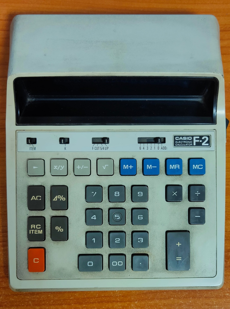 Начнем с офисного калькулятора CASIO F-2, выпущенного в 1977-м году.