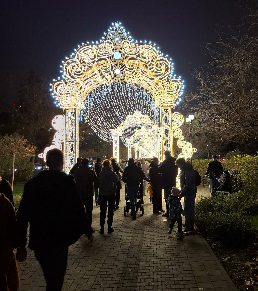 Красота и надвигающийся праздник выплеснулись из парка Галицкого на улицу Красную. Праздничное предновогоднее оформление парка "Краснодар" (так официально называется детище С. Н. Галицкого) восхищает жителей города и гостей каждый год. С наступлением темноты включается сказка. Украшенные гирляндами деревья принимают причудливые формы, на водоемах расцветают прекрасные лилии, на кустах замирают огромные бабочки, на полянах трубят ангелы, переливаются разными цветами шары, грибы, снеговики, пингвины, загадочно светят в ночи воздушные купола, спасающие теплолюбивые деревья от холода. Вместо настоящей воды по стенам водопада теперь струятся огоньки. Поражают воображение террасы волшебного светящегося шалфея. Все это добавляется к полюбившимся еще летом одуванчикам и ажурным древнегреческим колоннам. Чтобы не было сомнений, что грядет Новый год, наряжены елки. Прошлой зимой настоящий фурор вызвала инсталляция «Планеты». Когда к концу года планеты демонтировали, народ огорчился. И вот в утеш