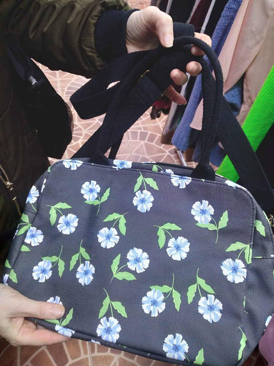 Здравствуйте, сегодня сумки, что можно было купить со скидкой 70%. Цены пишу полные, самая дешевая 1600, а самая дорогая более 3 тыс. Небольшая сумочка на молнии, есть короткие ручки и длинная. Сшита из жёсткой и немного шуршащей ткани с голубыми цветочками. Маленькая светло-розовая сумка на длинной ручке, ручка в виде цепочки, переплетенной ремешком, застегивается на магнит. Сумка-рюкзак из ткани. С одной стороны это сумка, а с обратной стороны есть лямки для плеч и сумка превращается, превращается сумка... в рюкзак)). Полная цена 3100. Небольшая сумка, большая часть светло-коричневая, отделка посветлее, только длинная ручка. Сумка сплетенная из широких лент. В меру жесткая и вместительная, с такой хорошо в магазин сходить. Небольшая сумка на очень жёстком каркасе. Знак бренда гордо блестит). Полная цена 2200. Лакированная сумка с улыбкой до ушей))). Если не путаю, то это саквояж. Полная цена 3100. sac voyage — буквально сумка для путешествия. И коричневая мягкая сумка с двумя рядам