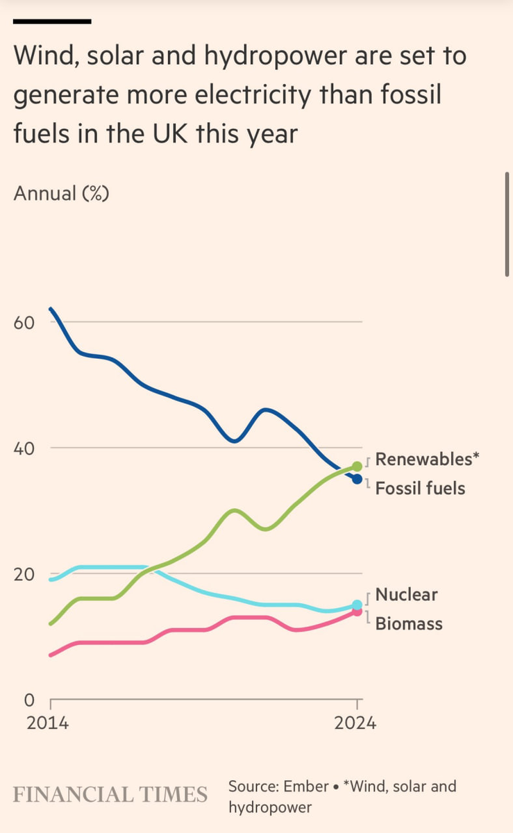 В Великобритании возобновляемые источники энергии (ветровые, солнечные и гидроэлектростанции) вышли на первое место по производству электроэнергии - почти 40 %! В России и 10 % нет