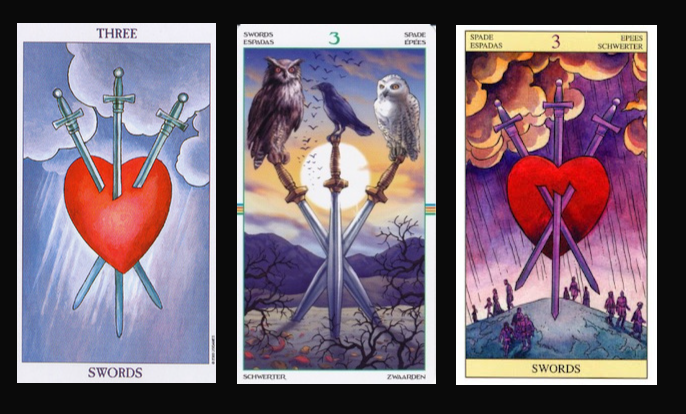 Тройка не исключение, одно только изображение сердца, проткнутого трижды, вызывает ассоциации со страданиями. Я называю эту историю "ранил, уб.ил, добил", когда три события, человека, новости, вещи не просто затрагивают тебя, но частично или кардинально меняют тебя (вкусы, предпочтения, планы, цели, отношение, видение). Мы помним, что Младшие Арканы показывают ситуации, потому, перемены тут не такие фундаментальные, как у Старших, однако, то, что приходит по Тройке, оставляет след - в душе, на сердце, в памяти.