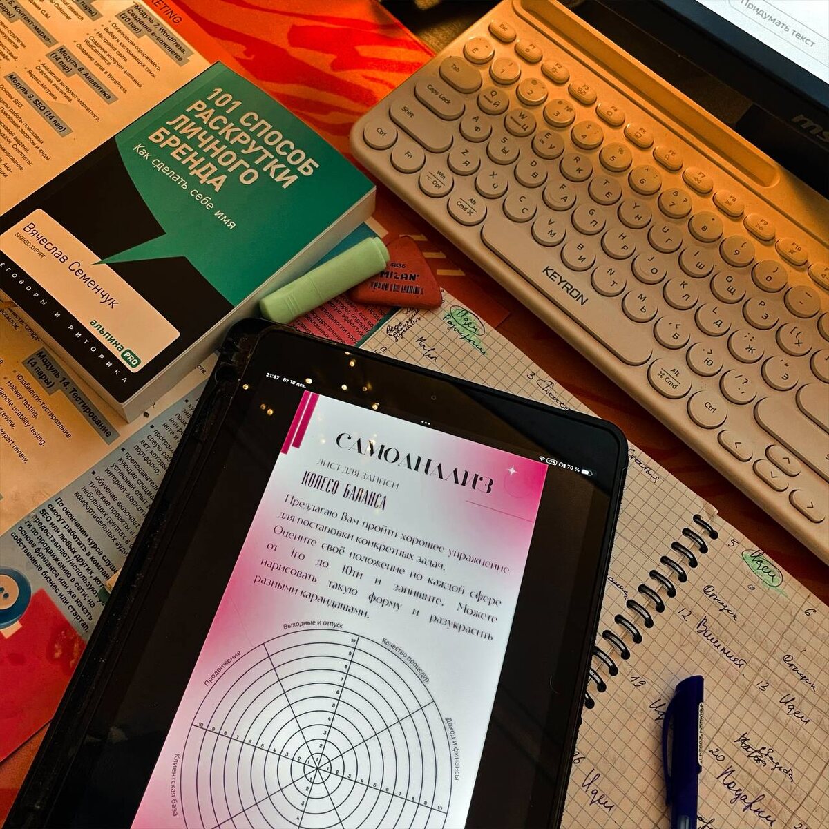 Я хочу рассказать о том, что я делаю с каждой ученицей на курсах повышения скорости маникюра. Каждый год, в начале декабря, я провожу анализ своего состояния и определяю, чего хочу достичь в будущем. С 5 класса мне привили привычку регулярно останавливаться и подводить итоги, и это стало неотъемлемой частью моей жизни. Одна из техник, с которой я работаю, называется «Колесо баланса». Я поделюсь с вами небольшим фрагментом из своего курса, но если хотите, я могу сделать и показать это упражнение не только для мастеров маникюра. Почему полезно выполнять «Колесо баланса» 1-2 раза в год: Улучшение самосознания. Это упражнение требует сосредоточенности на протяжении 1-1,5 часов. Снижение стресса. Вы можете увидеть, чего уже достигли и на каком этапе находитесь. Часто мы ругаем себя и не замечаем, за что стоит похвалить и каких высот мы уже достигли. Преодоление страхов. Когда вы точно знаете, что нужно сделать, становится легче сделать первый шаг к действию. Самомотивация. Как бы банально э