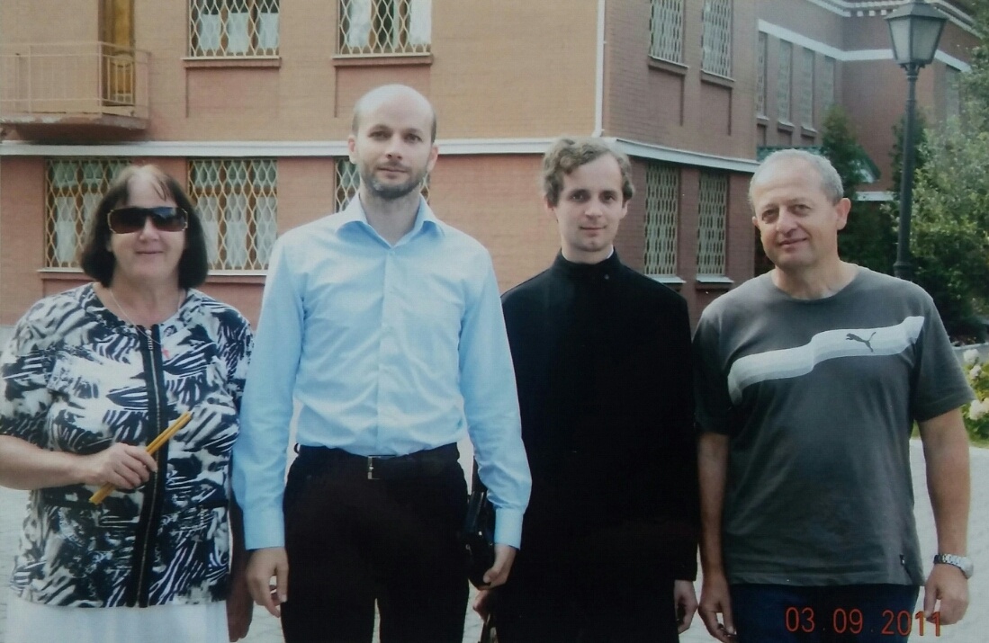 их экскурсовод по Лавре (у меня в телефонной книге написано два экскурсовода: Виталик и отец Георгий, думаю, что первый, так как он тогда учился в Киевской духовной академии, а может и в семинарии, но был один из лучших, ему высокие делегации доверяли водить, с ним и я договорился) и садовник (в голубой рубашке) Митрополита Киевского и всея Украины (западнорусьской части Руси), второго по чести в РПЦ, напротив части резиденции которого мы и стоим, бывшего детского сада, построенного в советское время вместе с Коньячным заводом и другими светскими заведениями для детей их работников, многие из которых там же жили, даже целый Городок для инвалидов был размещён в зданиях для монахов, их производств, торговли, турпотоков и других неугодных Богу дел (тыл, назарейство, поддержка не для того, для чего передовая, супружество, дело), всех их выселила новая власть после 1917 года и всё на этой территории забрала у РПЦ, которая была признана новой властью как друг старой, значит, враг, мина замедленного действия, обезврежена и обезоружена, дело царей лишено поддержки. Вот что значит не заниматься исключительно своим делом, религиозному приближаться к светскому, заниматься не лишь молитвой общины христиан, для которой храм, он для Чаши, она для новой Манны Небесной, пути на небо, в Царство Небесное, что во славу Отца Небесного, под началом Царицы Небесной и с Царём Небесным, Духом Святым, в службе Владыке вселенной, помощью средств Его небесно-земной Общины, молитвами святых и ангелов, подчинённых Богоматери и Богосына соответственно. Будет ещё две фотографии, которые они прислали маме из Израиля, куда более 20 лет назад вместе с дочкой уехали жить из Севастополя, и когда туда один раз летели через Киев, решили заехать ко мне. Я их и по Киеву повозил и в аэропорт отвёз, в общем вспомнил молодость, окунулся в детство. Фото в виде 3+3 (цв и ч/б) собраны заранее, вот пришло время этих, эта выпала на этот текст, дивны дела Твои, Господи, у ног Твоих и у ног твоих, Блаженнейший Владимир (Сабодан), моли Бога о нас. Ранее самой старой фотографией со мной была 20-летней давности. Думаю и по этой меня не узнать сейчас. А то не публиковал бы, известность лишает свободы, правильное это как и не подумаешь, потому что Божее, которое гениальнее гениального, проще простого, которое не там ищут, если в неправильном, грехах, как в шелках. Цветных фотографий оказалось далеко не столько, как чёрно-белых, вот приходится брать те, которые много раз откладывал в сторону, выбирая цветные. Система не мной сложена, так сложилось со временем за много лет
