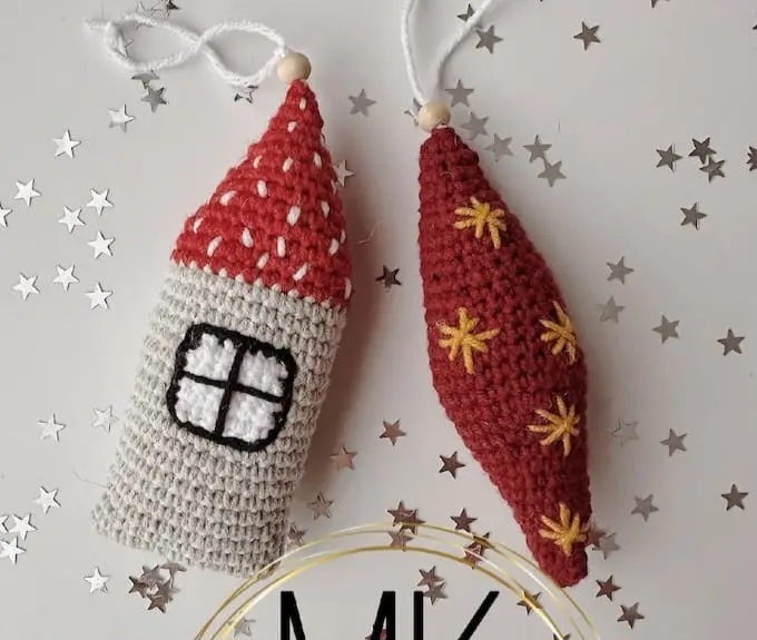 По данному описанию вы сможете связать ёлочные украшения крючком. Для вязания амигуруми понадобится любая пряжа, например, YarnArt Jeans, Alize Cotton Gold, Vita Lira и т.д. По этому МК можно связать две ёлочные игрушки: домик и ромбовидное украшение со звёздочками. Декоративные элементы на игрушках оформляются вышивкой. При желании можно использовать бусины. Oпиcaние вязaния aмигуpyми ёлочные игрушκи κpючκом: дοмиκ и pомбиκ