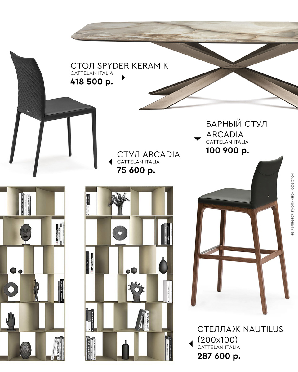 В сегодняшней подборке мы собрали одни из самых популярных моделей мебели от итальянской фабрики Cattelan Italia. Стул Arcadia - элегантный стул с мягкой обивкой и деревянным каркасом, создающим уют в интерьере. Стол Spyder Keramik - эффектный стол с металлическим основанием и керамической столешницей, устойчивой к повреждениям. Стеллаж Nautilus - асимметричные полки с эффектной отделкой делают этот стеллаж центром внимания. Барный стул Arcadia - современный стул с эргономичной формой и качественными материалами для комфорта. Мы являемся официальным дилером Cattelan Italia с 2014 года. Работая напрямую с фабрикой, мы предоставляем самые конкурентные условия по стоимости.
