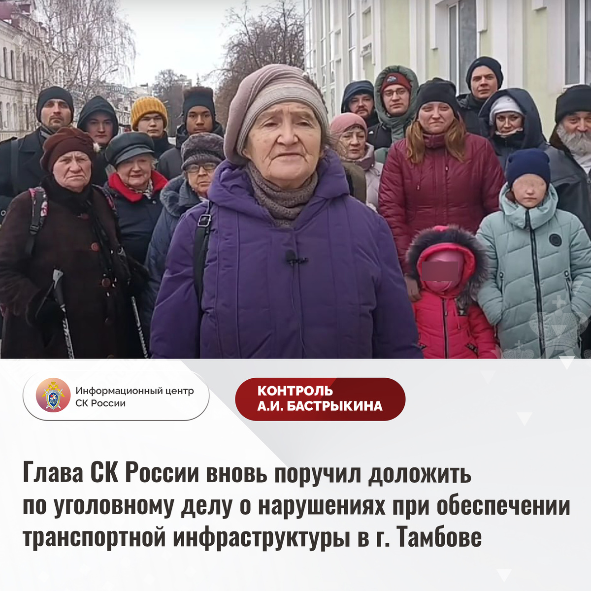 Глава СК России вновь поручил доложить по уголовному делу о нарушениях при обеспечении транспортной инфраструктуры в г. Тамбове В сети Интернет размещено видеообращение к Председателю СК России А.И. Бастрыкину от жителей Тамбовской области о несогласии с ходом установления обстоятельств факту разрушения транспортной инфраструктуры в городе Тамбове. Ранее, несмотря на возражения населения, принято решение об уменьшении количества троллейбусов в городе и их замене на автобусы. Указанные действия были обоснованы износом троллейбусных линий, что, по мнению граждан, не соответствует действительности. До настоящего времени виновные к ответственности не привлечены, расследование приняло затяжной характер. В СУ СК России по Тамбовской области расследуется уголовное дело, по которому ранее А.И. Бастрыкин неоднократно поручал представить доклад. Председатель Следственного комитета Российской Федерации Александр Иванович Бастрыкин вновь затребовал у руководителя СУ СК России по Тамбовской области