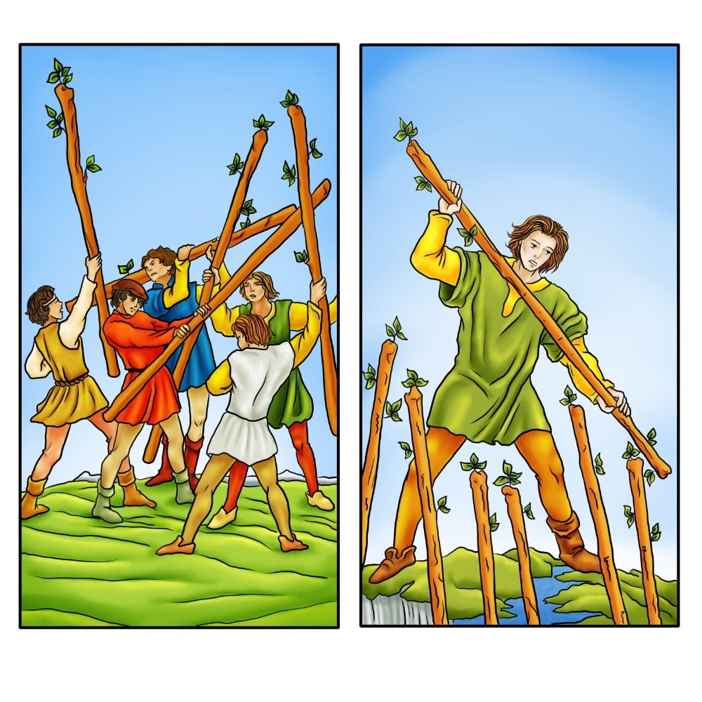 Обе карты связаны с борьбой и соперничеством, но природа этой борьбы различна. Ключевые слова: Главная идея 5 Жезлов