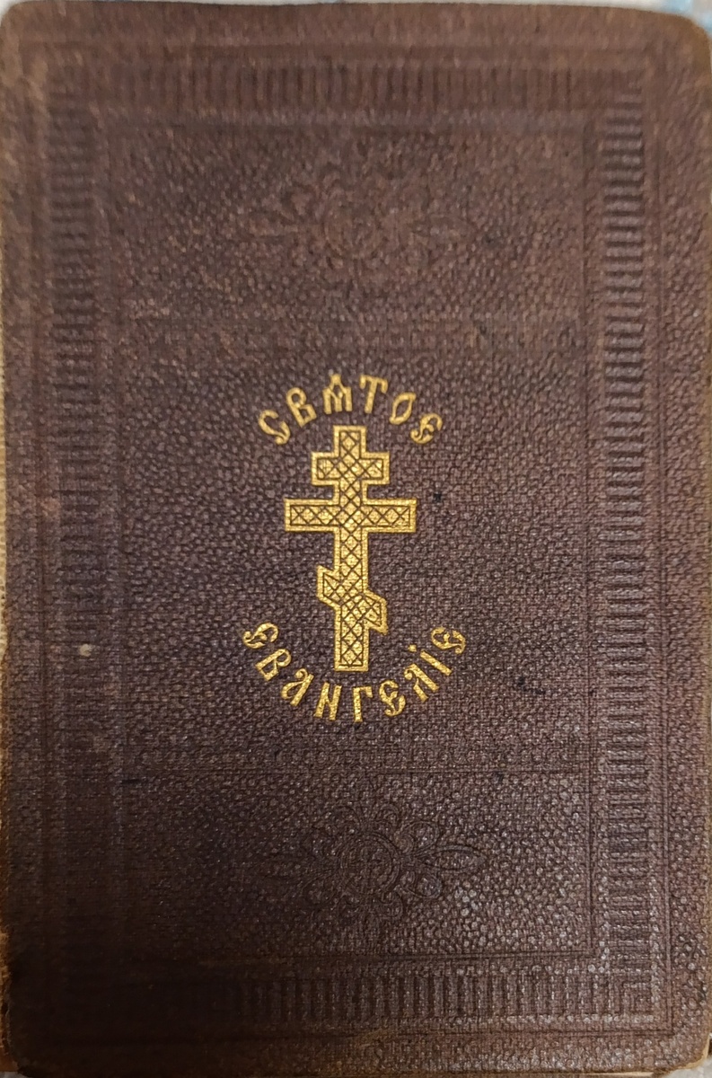 Переплет слепой, из картона, оклеен бумагой с изображением тисненого серебристого 8-конечного креста в центре. Корешок из коленкора. Форзацы с принтом из кругов, наложенных друг на друга, в коричневых тонах. На титуле в рамке, украшенной геометрическим орнаментом синего и красного цвета, синим и красным старославянским (церковнославянским) типографским шрифтом текст: вверху название, внизу выходные данные, между ними виньетка. Нумерация по страницам, буквенная. Содержит четыре Евангелия (Матфея, Марка, Луки и Иоанна), указания евангельских чтений церковных в неделях всего лета.. М.,1893.